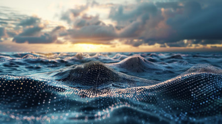 A beautiful sunset over the ocean, capturing the serene waves under the twilight sky. The golden hues of the sky reflect over the calm waters, showcasing a tranquil and peaceful scene. Ideal for relaxation and nature themes.