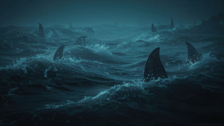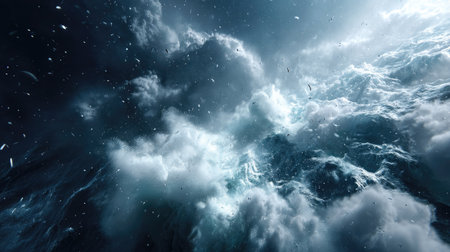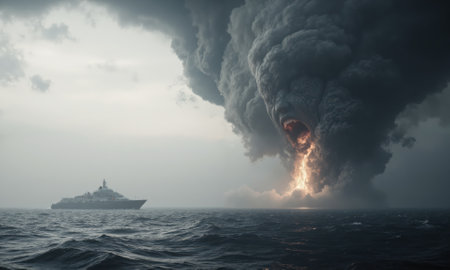 A powerful storm brews over the ocean as lightning strikes in the distance. Dark clouds swirl menacingly above crashing waves, creating a breathtaking and intense atmosphere.