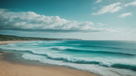 This breathtaking image showcases foamy waves gently rolling up the shoreline, encapsulating the timeless harmony between the oceans movement and tranquil coastal scenery under a bright, open