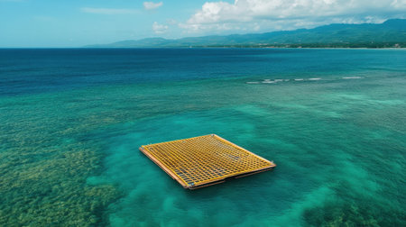 An aerial image showcasing a vibrant floating platform in clear tropical waters, surrounded by picturesque green hills under a bright blue sky. Ideal for travel and nature themes.