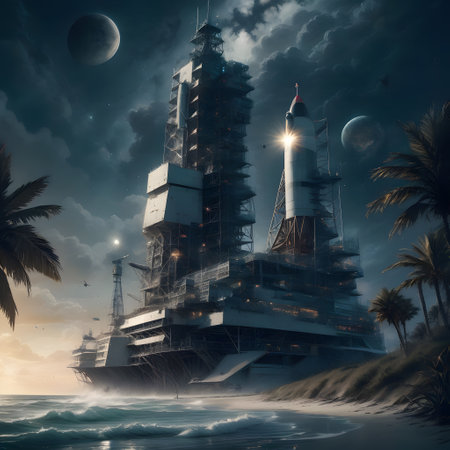 Rocket launching at night from coastal launchpad with clouds and fire
