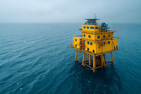 Offshore oil rig extracting fossil fuels in the ocean amid growing climate change concerns