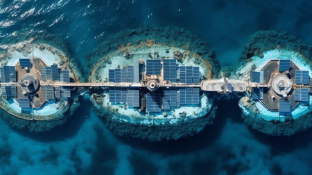 Generative AI, Offshore electricity substation, solar and wind turbine facility, ocean landscape