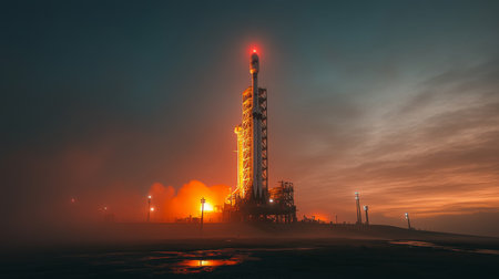 Rocket Stands Ready for Launch at Night, Showcasing Flames and Smoke Against a Dark Sky While Preparing for Spaceflight and Propulsion Generative AI