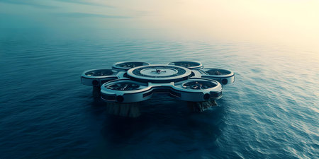 Monitoring a Futuristic Aerial Drone Over a Sprawling Floating Platform in the Ocean. Concept Aerial Photography, Futuristic Technology, Ocean Exploration, Monitoring Systems