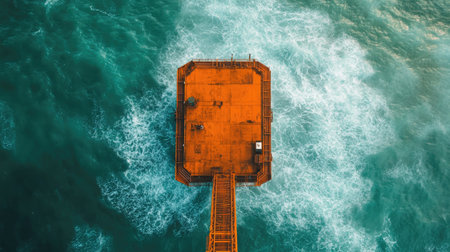 A striking oil platform rises from the waves in a stormy sea under a moody sky. This industrial structure highlights offshore drilling and marine technology amidst nature's elements.
