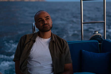 Young african american man relaxing on a sailboat in open sea at sunset