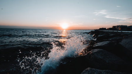 A powerful wave crashes against dark rocks on the coast as the sun sets over the horizon, casting a warm, golden light across the tranquil sea and sky.