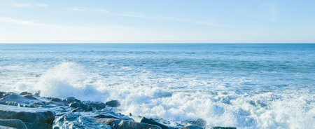 Seascape of rocky beach. Sea waves crash and splash on rocks. View of the sea, ocean. Natural soft blue background. View of the black sea, Batumi