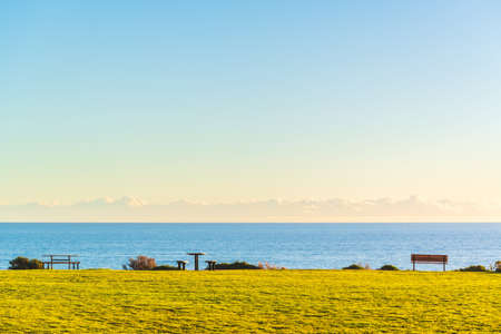 Maslin Beach seashore spectacular view with picnic tables and a bench at sunset, South Australia