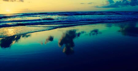 A serene coastal scene at dusk with a colorful sky mirrored on the receding tide, creating a beautiful and peaceful waterscape with gentle waves washing ashore.