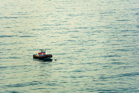 Fisher sea boat. Tourist maneuvering an inflatable boat while fishing in a life jacket, with the beautiful sunset sea in the background. a relaxing fishing trip.