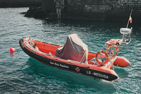 Puerto de la Cruz, Tenerife, Spain - July 01, 2023: Red Cross rescue boat in the port.