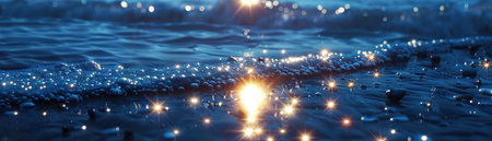 Experience the tranquility of a serene beach scene at night, where sparkling lights dance over soft waves and the calm water reflects the beauty of a starry sky.