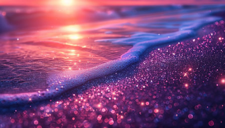 Sunlit sand textures at sunset with glittering pink reflections. That the image is generated using AI.