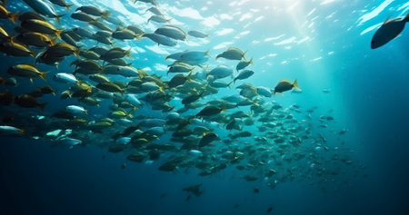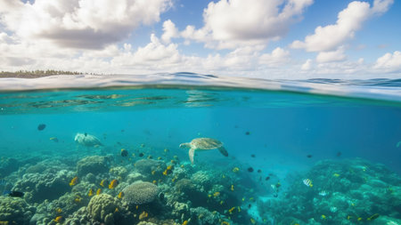 Vibrant underwater scene with colorful fish swimming around a coral reef, illuminated by natural sunlight