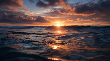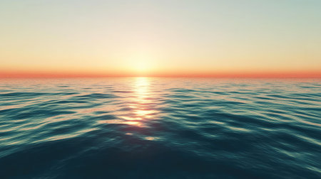 Serene sunset over ocean creates beautiful reflection on water surface, showcasing vibrant hues of orange and gold. calm waves gently ripple, enhancing tranquil atmosphere