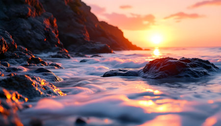 Stunning sunset over the ocean with waves crashing on the shore. Peaceful and serene atmosphere