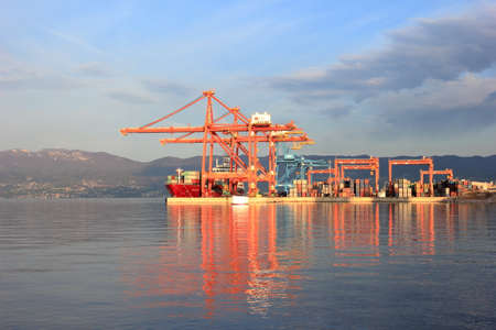 VANCOUVER, CANADA - OCTOBER 28, 2018: Centennial Terminals is a major commercial dock with container cranes and heavy lift machinery.