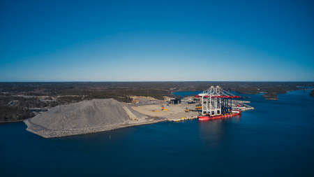 Container cargo ship loading North Arctic port. Concept freight transportation import export and business logistic, aerial view winter.