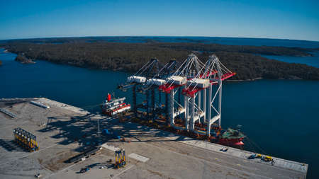 Gothenburg, Sweden - december 04 2022: Shipping containers being loaded on container ship Munich Maersk