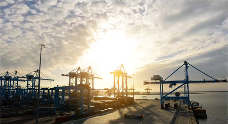 Panorama of Djibouti port with ships and cargo crane