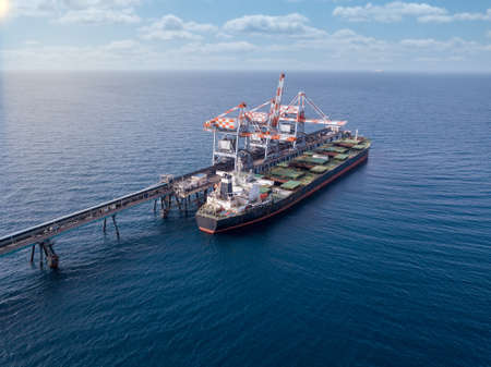 cargo ship loading in coal cargo terminal view from above