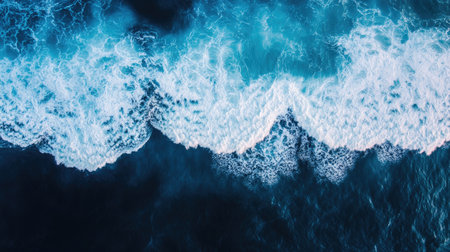 Top aerial view of deep blue waters of ocean with white foam. Drone travel summer background