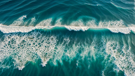 The majestic beauty of the ocean as viewed from a drone, showing the detailed textures and forms of waves crashing into the sea from a top view perspective.