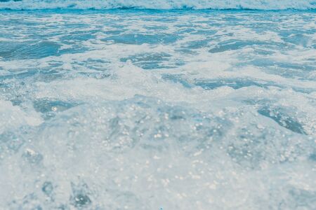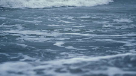 Ocean wave foam splashing in abstract nature background. Blue sea water texture foam storming in climate change environment close up. Dark waterscape surface crash outside. Travel no people concept.