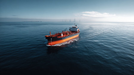 Large oil tanker embarks on journey gliding across open sea. Vessel transports valuable oil and fuel to ports around world. Global connectivity aerial view