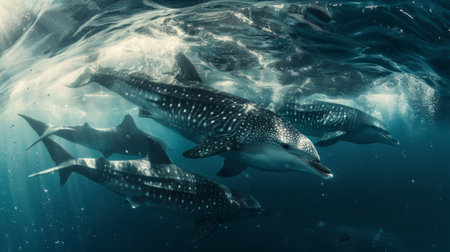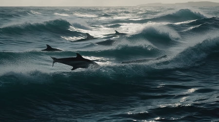 A group of dolphins playing and swimming together in the ocean created with Generative AI