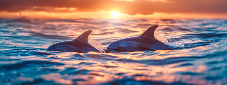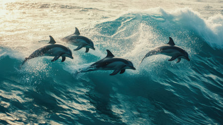 A captivating scene of dolphins gracefully leaping through vibrant ocean waves, captured during a golden sunset, highlighting their playful energy and natural beauty.