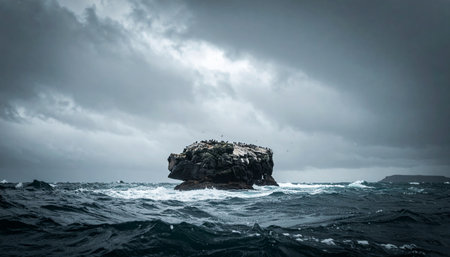 A solitary rock formation stands firm against the turbulent waves of a stormy sea. Amidst the dark, dramatic clouds, a single sunbeam breaks through, illuminating the scene and offering a powerful symbol of hope, resilience, and endurance in the face of adversity. This epic and moody seascape captures the raw power and untamed beauty of nature.