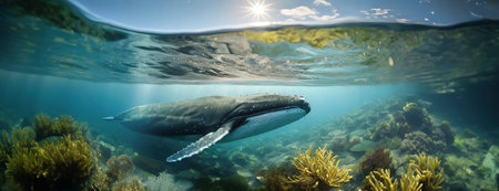 A whale swims underwater with sunlight filtering through the water surface, surrounded by vibrant marine life and coral reefs