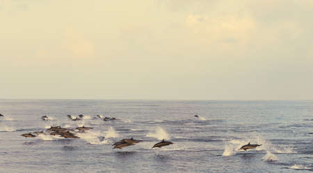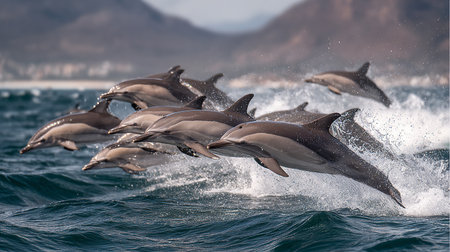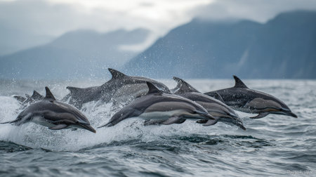 A group of dolphins are captured mid-jump, emerging from the water. The image showcases the sleek bodies and aquatic environment. The scene is illuminated by soft light, complemented by a muted color palette. The composition suggests potential use for marine life documentation and nature-themed publications.