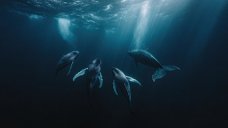 Four dolphins are swimming together in the deep blue ocean, creating a beautiful and serene underwater scene, with sunbeams filtering through the water