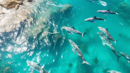 Aerial view captures a pod of dolphins gracefully swimming in crystal clear turquoise water, creating a mesmerizing spectacle of marine wildlife