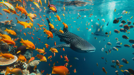 A school of colorful fish swimming alongside a whale shark, forming a symbiotic relationship as they feed on the scraps left behind by the gentle giant, a stunning display of marine biodiversity.