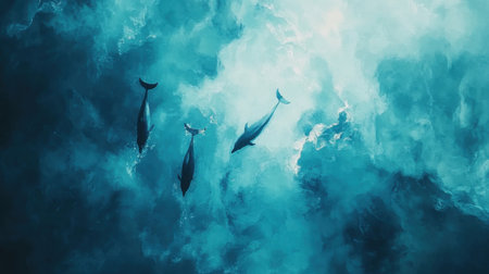 Generative AI : Aerial view of dolphins swimming along the coastline across the ocean waves