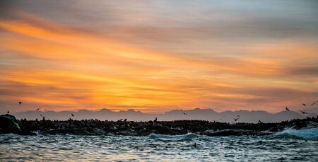 Seals silhouettes on the rock island. Sunrise Sky Background. Seal Island on sunrise. Cape fur seal, Scientific name: Arctocephalus pusilus. South Africa