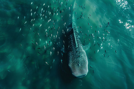 A massive whale shark glides gracefully through serene turquoise waters, surrounded by a lively school of small fish, enjoying a peaceful aquatic moment.