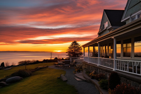 seaside bed and breakfast with sunset, created with generative ai