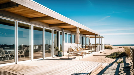 A modern beach house built with wood and blue materials generated by artificial intelligence