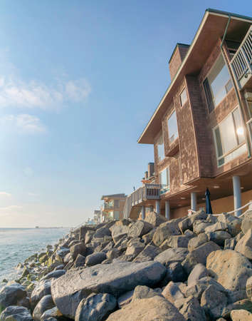 Multi-storey accommodation buildings near the rocky shoreline of Oceanside in California