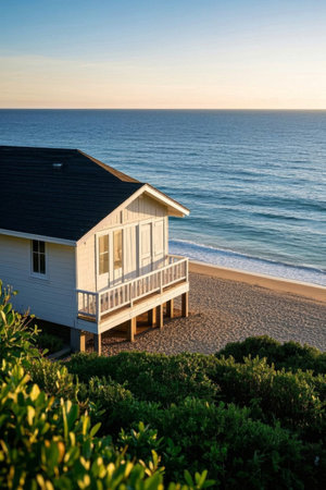 cape cod house with view of sunset over the ocean, waves rolling in, created with generative ai