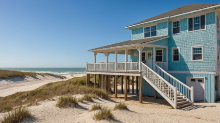 A coastal house featuring pastel blue shingles stands on stilts above sandy dunes, providing stunning views of the beach and ocean under a clear blue sky.
