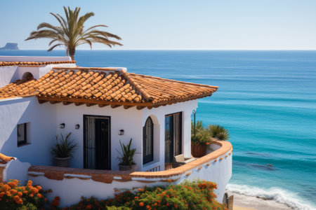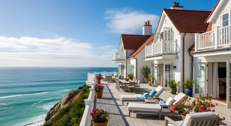 A luxurious white beach house features a large deck overlooking the blue ocean. Red tiled roofs and white railings contrast beautifully with the clear sky and turquoise water.