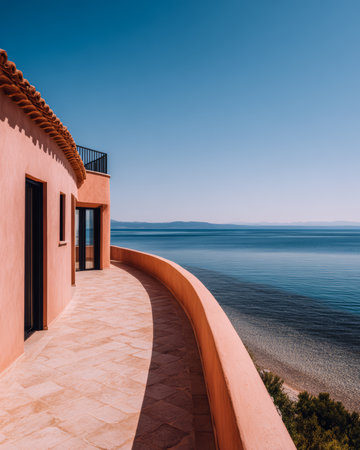 A spacious balcony wraps around a modern villa, providing breathtaking views of calm blue waters and distant mountains on a sunny day. The perfect spot for relaxation.