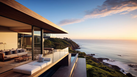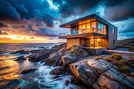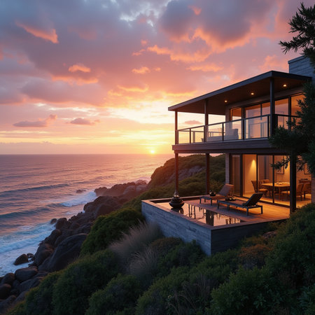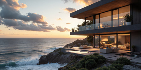 Overlooking a serene ocean, a sleek beachfront residence blends seamlessly into the rocky terrain. The sun sets, casting a warm glow on the modern architecture surrounded by lush greenery.